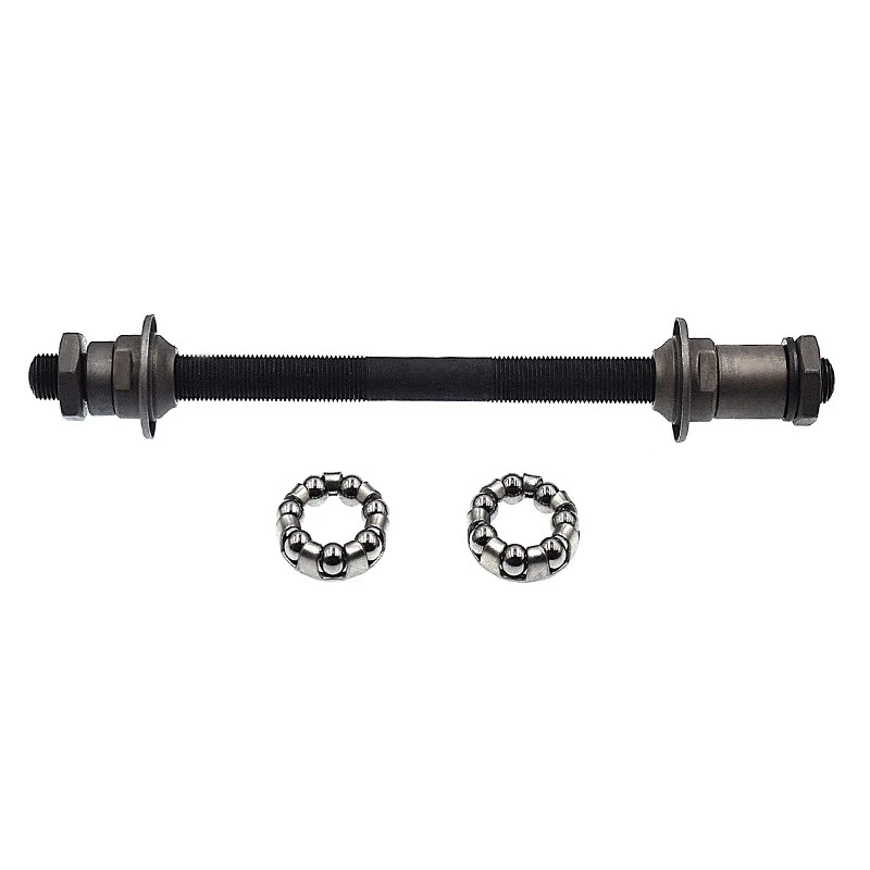 L’axe est fourni avec 2 entretoises, 1 rondelle, 2 coupelles et 2 écrous ainsi que 2 cages de 7 billes permettant une parfaite rotation dans le moyeu de la roue.